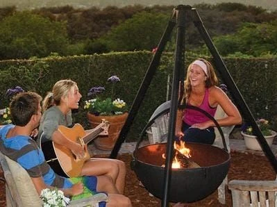 1) SUSPENDED BASIN DESIGN A Cowboy Cauldron basin is suspended in the air. This is amazing for lots of reasons. First, you can get your feet right up underneath the fire on a cold day. Niiice… Try doing that with a fire pit! Second, unlike a ground fire, the smoke from a Cauldron is already on its way up and away from you by the time it leaves the rim of the basin. We love wood smoke, but hey. A little is great, but a face-full is too much! The Cauldron is better than a ground fire, or anything that sits on the ground, by a long, long shot. Sit by one for an hour, and every other fire feature you ever sit next to for the rest of your life will make you wish you were sitting by a Cowboy Cauldron.